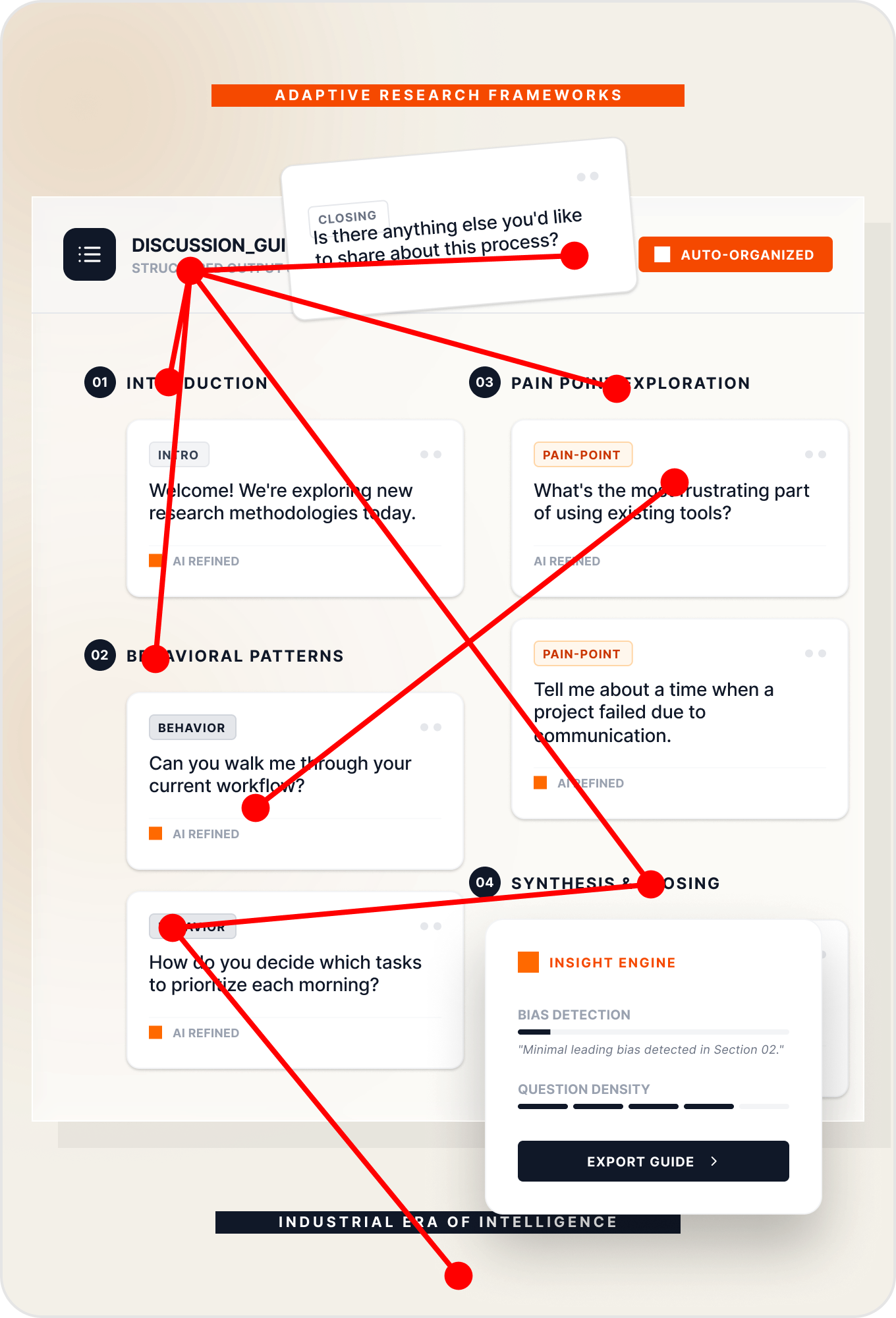 Our LLM-native engine doesn't just draft questions; it builds a strategic logic tree. It predicts participant bias and injects counter-probes to ensure data integrity from the start.